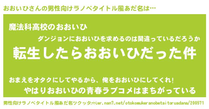 | 女子向けラノベタイトル風あだ名 | 『おおいひの玉の輿計画!』 |