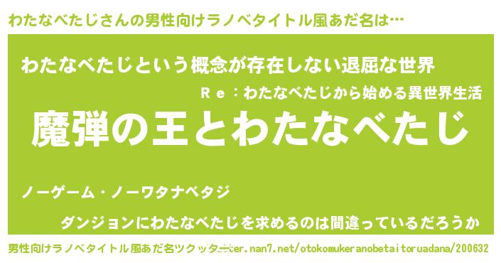 | 女子向けラノベタイトル風あだ名 | 『乙女ゲームの破滅フラグしかない悪役わたなべたじに転生してしまった…』 |
