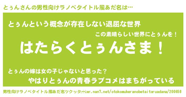 | 胡散臭い通販商品みたいなあだ名 | 『絶対に幸福をもたらす水素水…その名も「とぅん」』 |