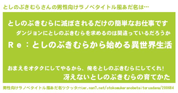 | 意味不明あだ名 | 『自称としのぶきむら』 |