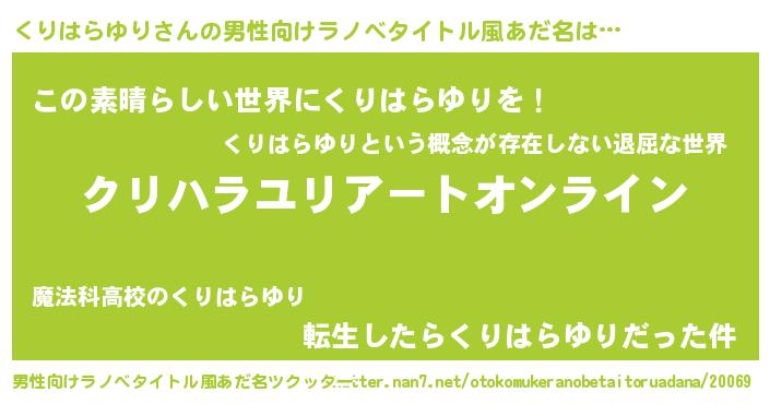 | 胡散臭い通販商品みたいなあだ名 | 『億万長者になれる霊験あらたかなお札…その名も「くりはらゆり」』 |