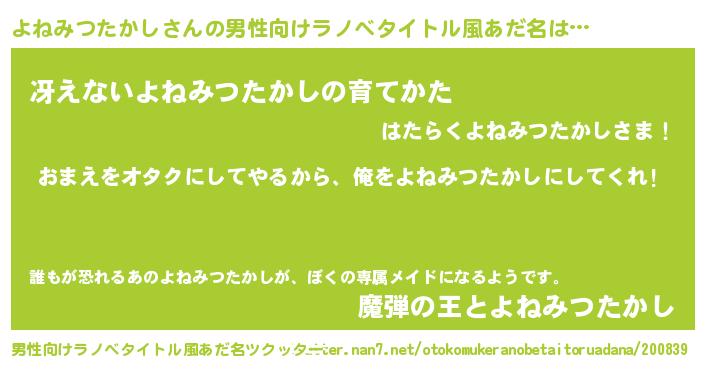 | 女子向けラノベタイトル風あだ名 | 『よねみつたかし夫妻のなれそめ』 |