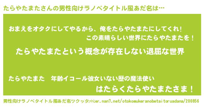| 胡散臭い通販商品みたいなあだ名 | 『絶対に幸福をもたらす水素水…その名も「たらやたまた」』 |