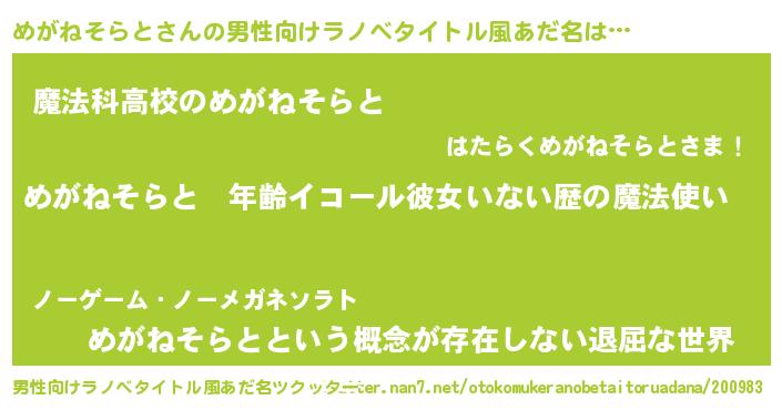 | 女子向けラノベタイトル風あだ名 | 『めがねそらとの玉の輿計画!』 |