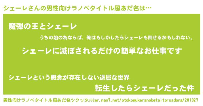 | 意味不明あだ名 | 『住所不定無職シェーレ(14歳)』 |