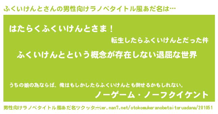 | 女子向けラノベタイトル風あだ名 | 『異世界で失敗しない100のふくいけんと』 |