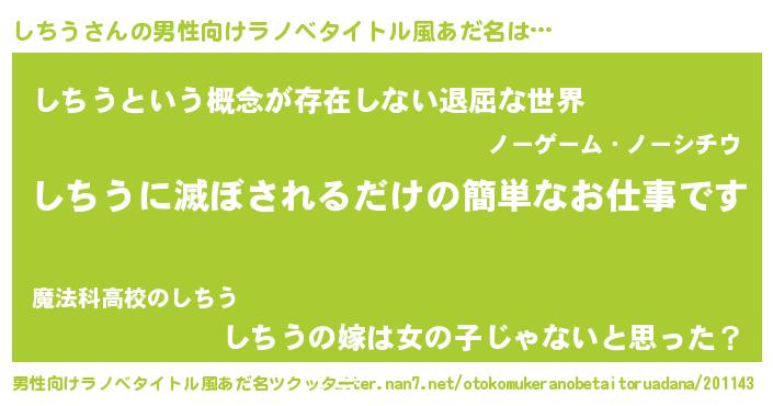 | 胡散臭い通販商品みたいなあだ名 | 『来世でも幸せになれる水素水…その名も「しちう」』 |