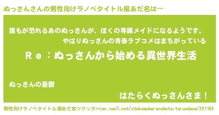| 女子向けラノベタイトル風あだ名 | 『ぬっさんストレイドッグス』 |