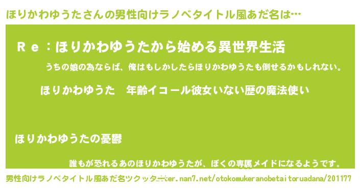 | 女子向けラノベタイトル風あだ名 | 『ほりかわゆうたの玉の輿計画!』 |