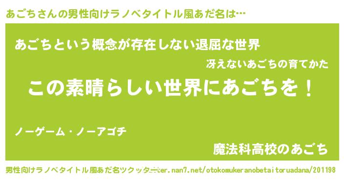 | 意味不明あだ名 | 『住所不定無職あごち(50歳)』『自称あごち』 |