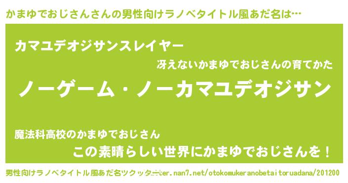 | 女子向けラノベタイトル風あだ名 | 『死神かまゆでおじさんの再婚』 |