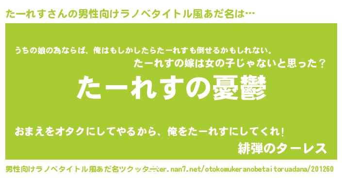 | 女子向けラノベタイトル風あだ名 | 『たーれす姫と円卓の騎士』 |
