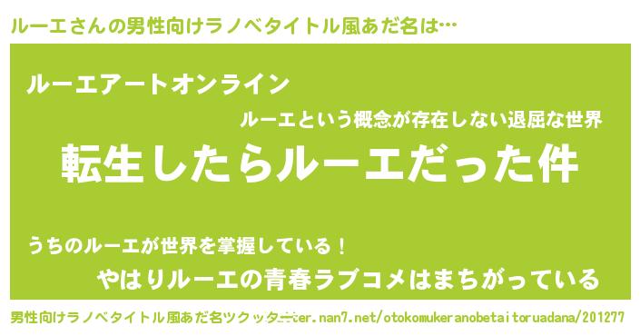 | 女子向けラノベタイトル風あだ名 | 『ルーエの玉の輿計画!』 |