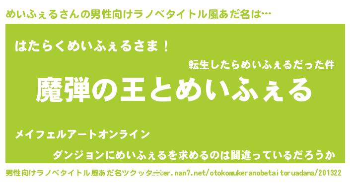 | 意味不明あだ名 | 『住所不定無職めいふぇる(9歳)』 |