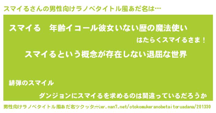 | 女子向けラノベタイトル風あだ名 | 『異世界で失敗しない100のスマイる』 |