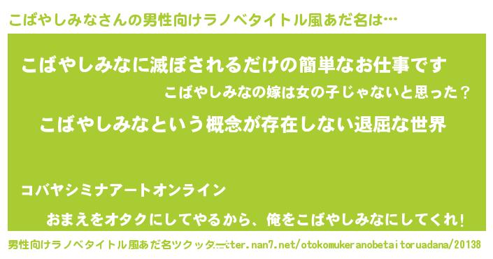 | 女子向けラノベタイトル風あだ名 | 『異世界で失敗しない100のこばやしみな』 |
