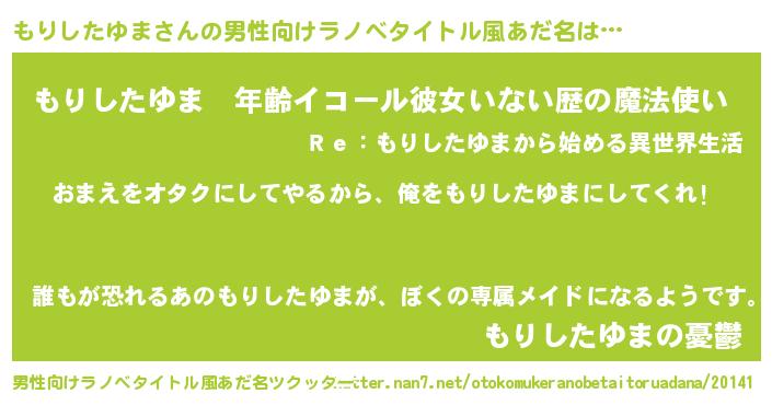 | 女子向けラノベタイトル風あだ名 | 『もりしたゆま夫妻のなれそめ』 |