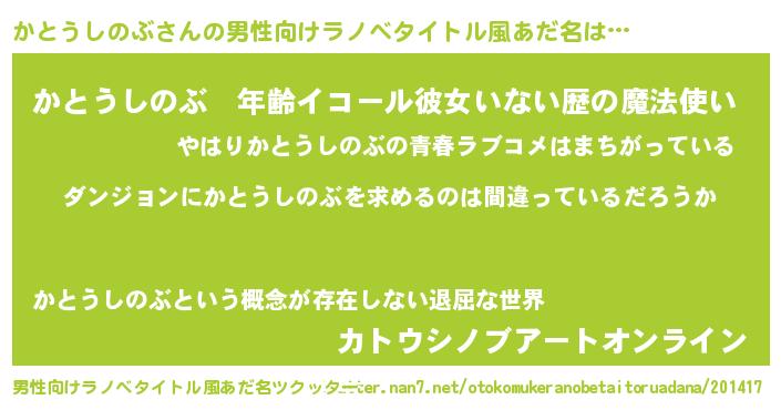 | 女子向けラノベタイトル風あだ名 | 『かとうしのぶは平凡を望む』 |