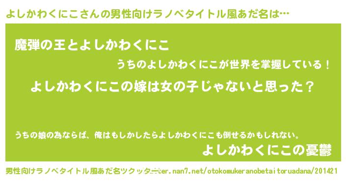 | 胡散臭い通販商品みたいなあだ名 | 『全米が絶賛したサプリメント…その名も「よしかわくにこ」』 |