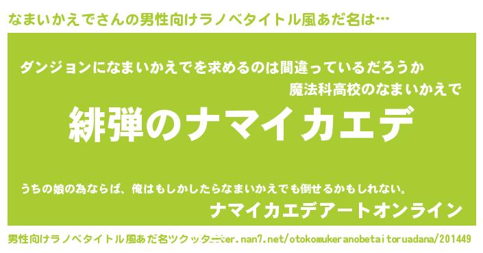 | 胡散臭い通販商品みたいなあだ名 | 『信頼と実績のサプリメント…その名も「なまいかえで」』 |