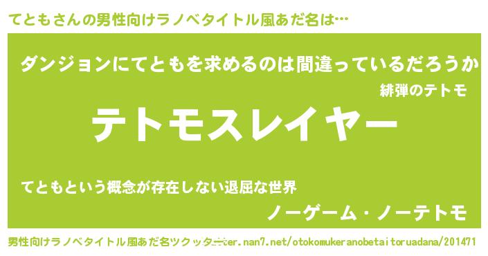 | 胡散臭い通販商品みたいなあだ名 | 『信頼と実績のサプリメント…その名も「てとも」』 |