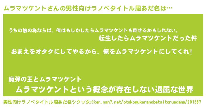 | 女子向けラノベタイトル風あだ名 | 『ムラマツケント夫妻のなれそめ』 |