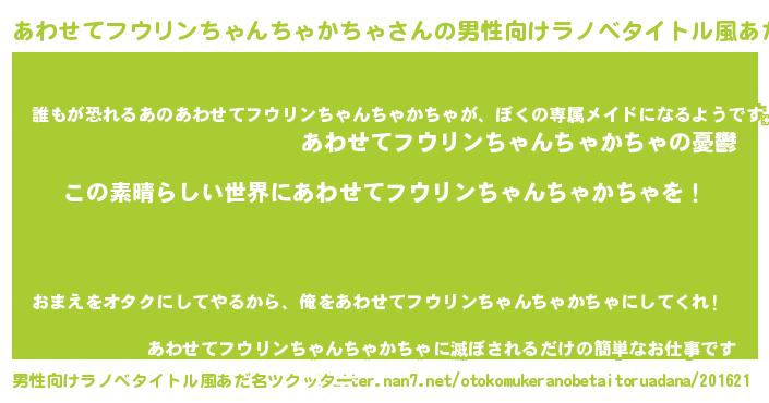 | 女子向けラノベタイトル風あだ名 | 『悪役あわせてフウリンちゃんちゃかちゃに転生したようですが、知った事ではありません』 |