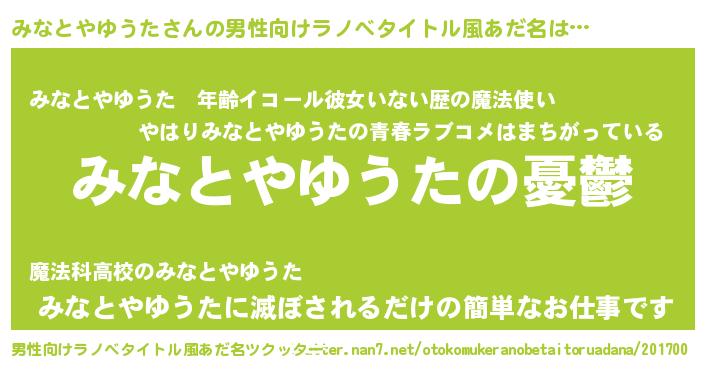 | 女子向けラノベタイトル風あだ名 | 『(仮)みなとやゆうたのやんごとなき事情』 |