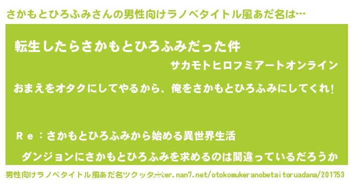 | 女子向けラノベタイトル風あだ名 | 『さかもとひろふみ夫妻のなれそめ』 |