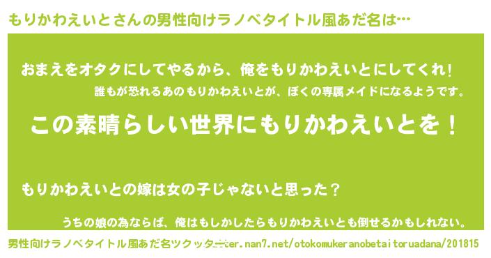 | 胡散臭い通販商品みたいなあだ名 | 『あなたにだけ特別に提供する限定10本のレアな日本酒…その名も「もりかわえいと」』 |