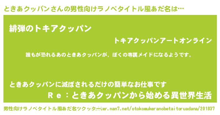 | 女子向けラノベタイトル風あだ名 | 『異世界でカフェときあクッパンを開店しました。』 |