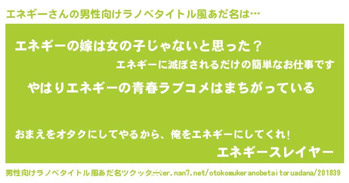 | 女子向けラノベタイトル風あだ名 | 『エネギー伯爵の花嫁』『エネギー恋絵巻』 |