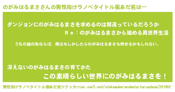 | 女子向けラノベタイトル風あだ名 | 『のがみはるまさ伯爵の花嫁』 |