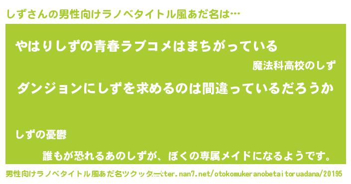 | 女子向けラノベタイトル風あだ名 | 『しずの卵を拾いまして』 |