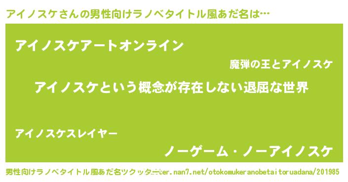 | 女子向けラノベタイトル風あだ名 | 『異世界で失敗しない100のアイノスケ』 |