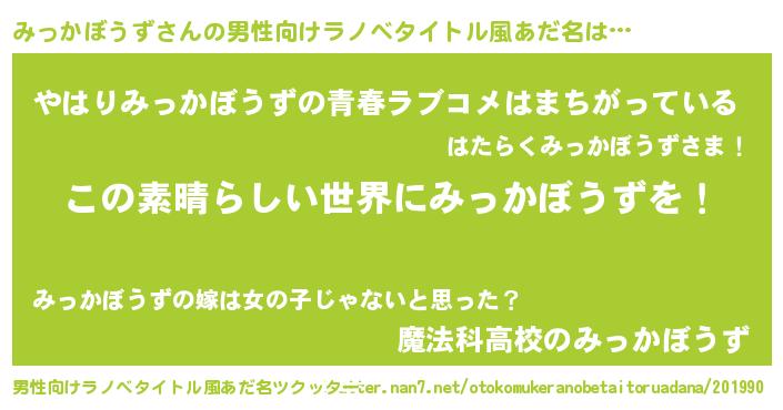 | 女子向けラノベタイトル風あだ名 | 『乙女ゲームの破滅フラグしかない悪役みっかぼうずに転生してしまった…』 |