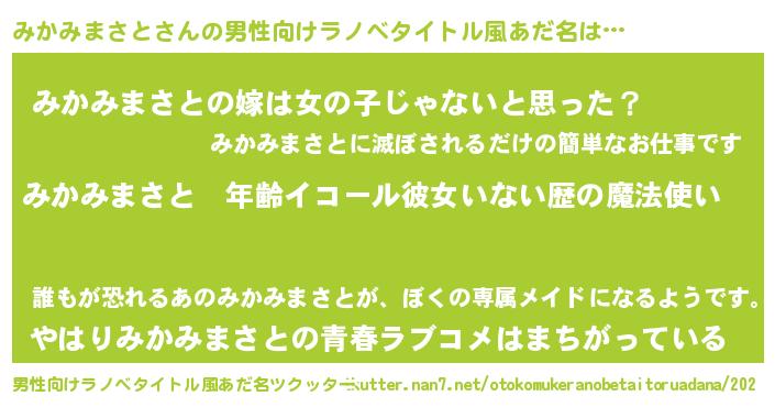 | 女子向けラノベタイトル風あだ名 | 『みかみまさとの玉の輿計画!』 |