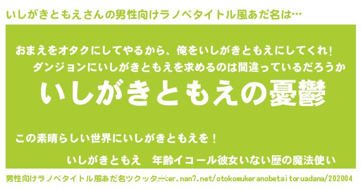 | 胡散臭い通販商品みたいなあだ名 | 『必ず成功する霊験あらたかなお札…その名も「いしがきともえ」』 |