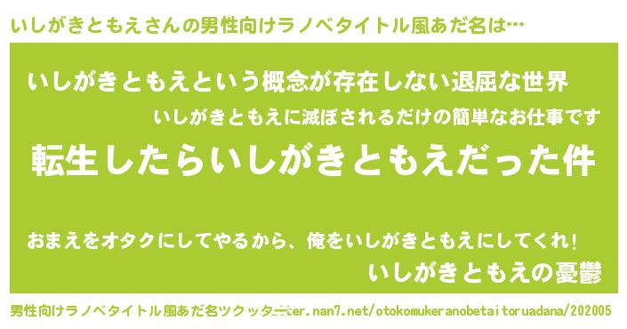 | ヘコむあだ名 | 『いしがきともえ(震え声)』『いしにー』 |