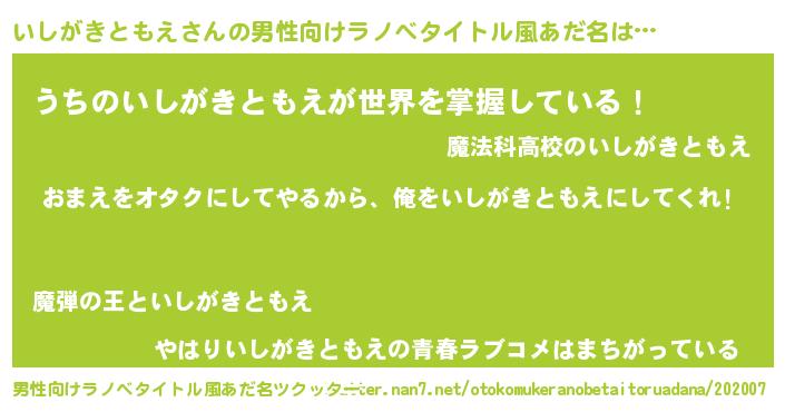 | 女子向けラノベタイトル風あだ名 | 『いしがきともえ夫妻のなれそめ』 |
