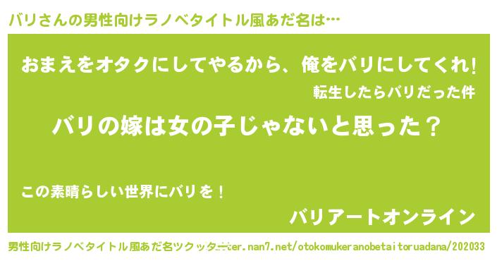 | 女子向けラノベタイトル風あだ名 | 『バリの卵を拾いまして』『バリ恋絵巻』 |