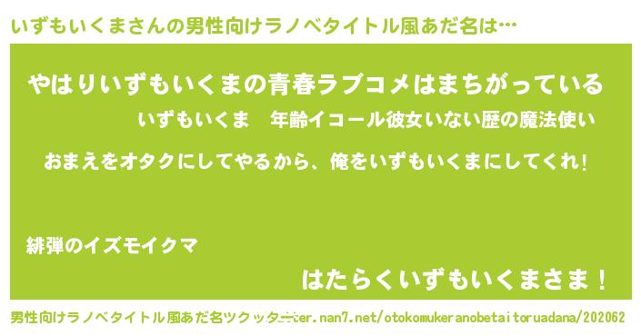 | 女子向けラノベタイトル風あだ名 | 『いずもいくま恋絵巻』 |