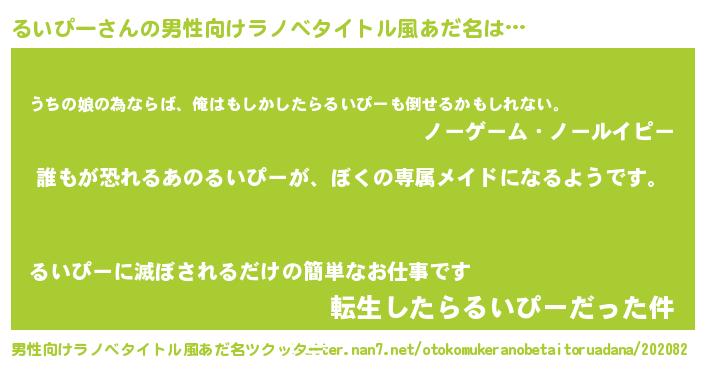 | 女子向けラノベタイトル風あだ名 | 『るいぴーの契約王妃』『るいぴー恋絵巻』 |