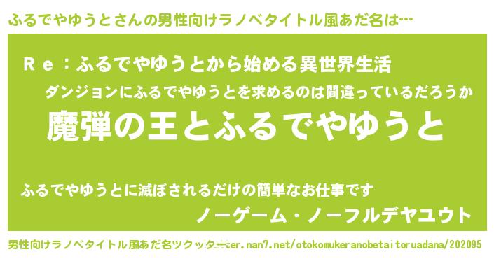 | 女子向けラノベタイトル風あだ名 | 『ふるでやゆうとが死なない童話 林檎のふるでやゆうとの診療簿』 |