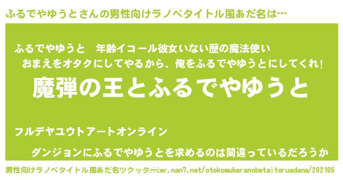 | 女子向けラノベタイトル風あだ名 | 『ふるでやゆうとが死なない童話 林檎のふるでやゆうとの診療簿』 |