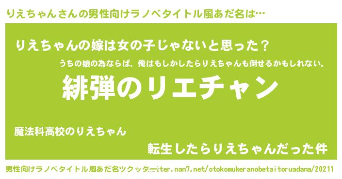 | 女子向けラノベタイトル風あだ名 | 『シンデレラりえちゃん家の靴箱館』 |