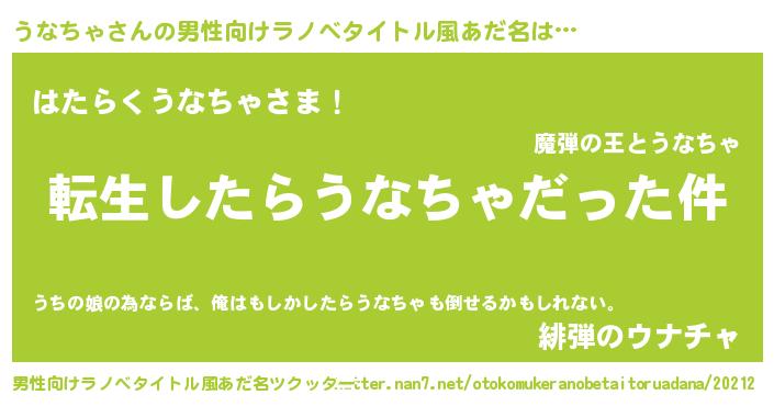 | 女子向けラノベタイトル風あだ名 | 『うなちゃの玉の輿計画!』 |