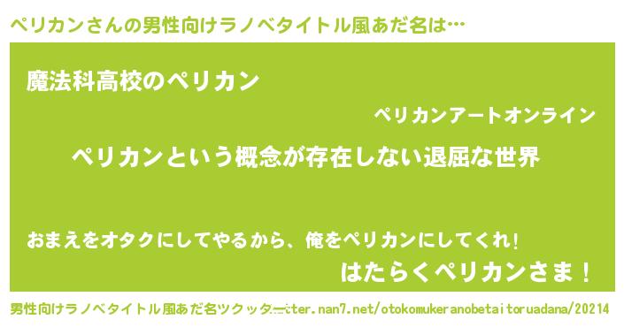 | 女子向けラノベタイトル風あだ名 | 『異世界で失敗しない100のペリカン』 |