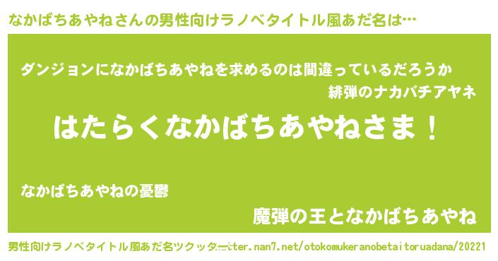 | 胡散臭い通販商品みたいなあだ名 | 『信頼と実績のサプリメント…その名も「なかばちあやね」』 |