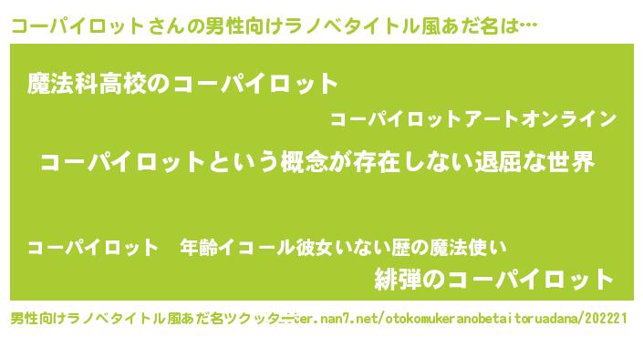 | 胡散臭い通販商品みたいなあだ名 | 『来世でも幸せになれる健康食品…その名も「コーパイロット」』 |